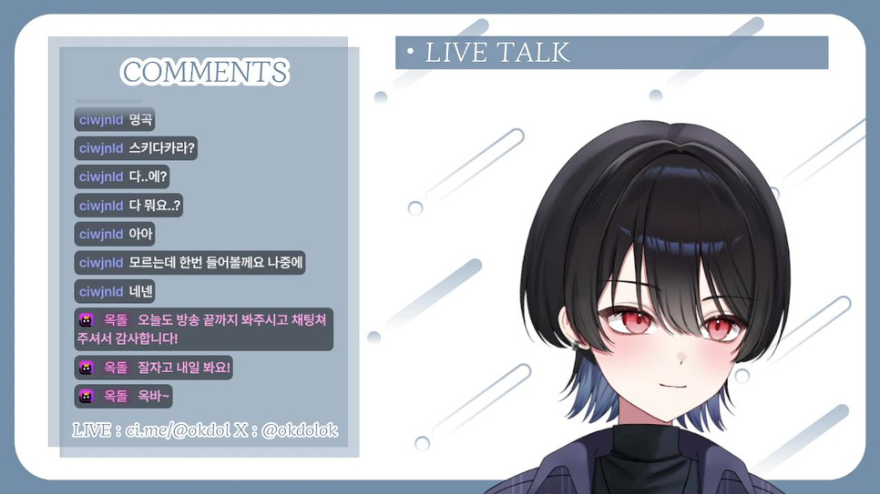 옥하옥하~ 커뮤니티 첫 게시글은 방송 채팅 규칙 공지입니다! 📢 💬 방송 흐름과 관련 없거나 무례한 채팅 ❌ 💬 시청자 수 및 과도한 타 스트리머 언급 ❌ 💬 과한 반말이나 호칭 ❌ 💬 시청자 간 대화 및 친목 ❌ 💬 정치, 종교 등 민감한 내용 ❌ 💬 신상 관련 발언 ❌ 방송에서 봐요~ 옥빠옥빠~🤚